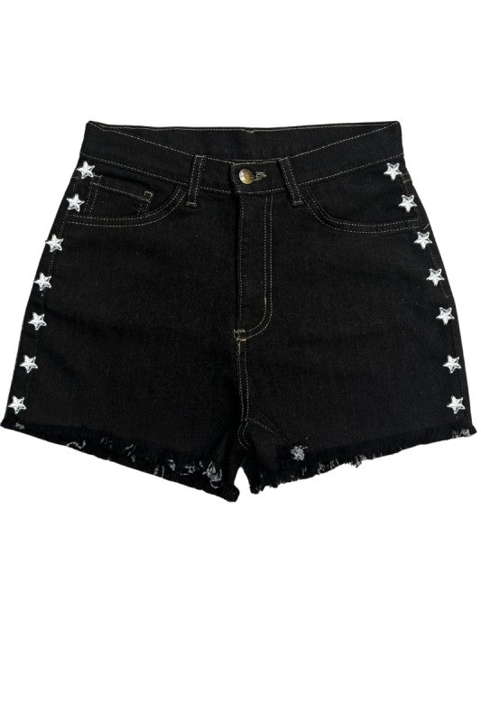Classic 5 Pocket Denim Short with Front button and zipper closure, front and back pockets, Diamond Star Studded detail, frayed hem, Made in the USA