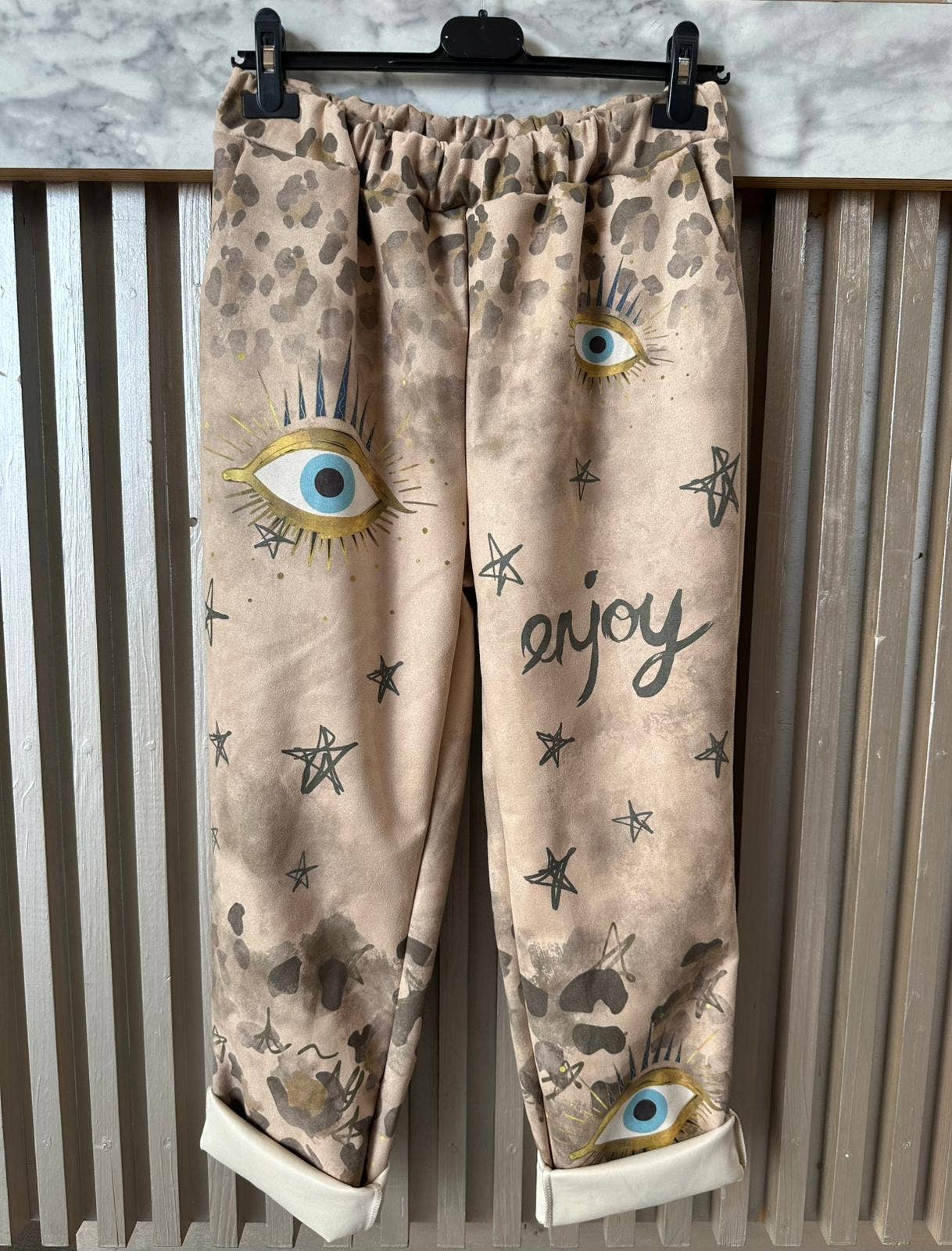 These joggers feature a soft, beige-toned background adorned with artistic eye illustrations, stars, and abstract patterns. The design includes the word "enjoy" in a casual script, along with dreamy and mysterious motifs in black, gray, and blue accents. Crafted for comfort with an elastic waistband and rolled cuffs, they exude a whimsical, artistic vibe perfect for casual, creative, or relaxed streetwear styles.